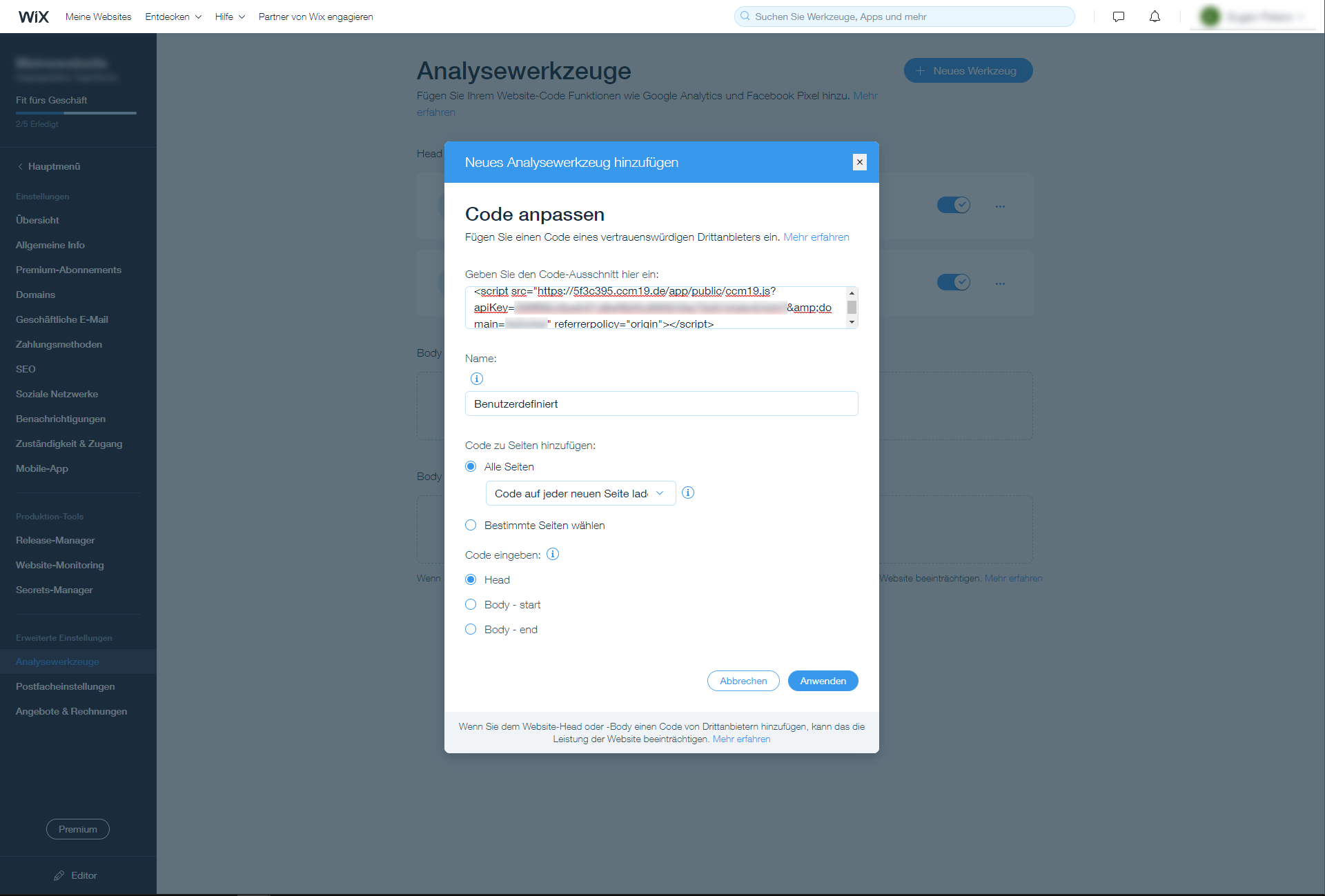 Um unseren Cookie Consent Manager für Ihren Wix-Blog oder Ihre Wix-Webseite zu installieren, führen Sie einfach die folgenden Schritte aus:
